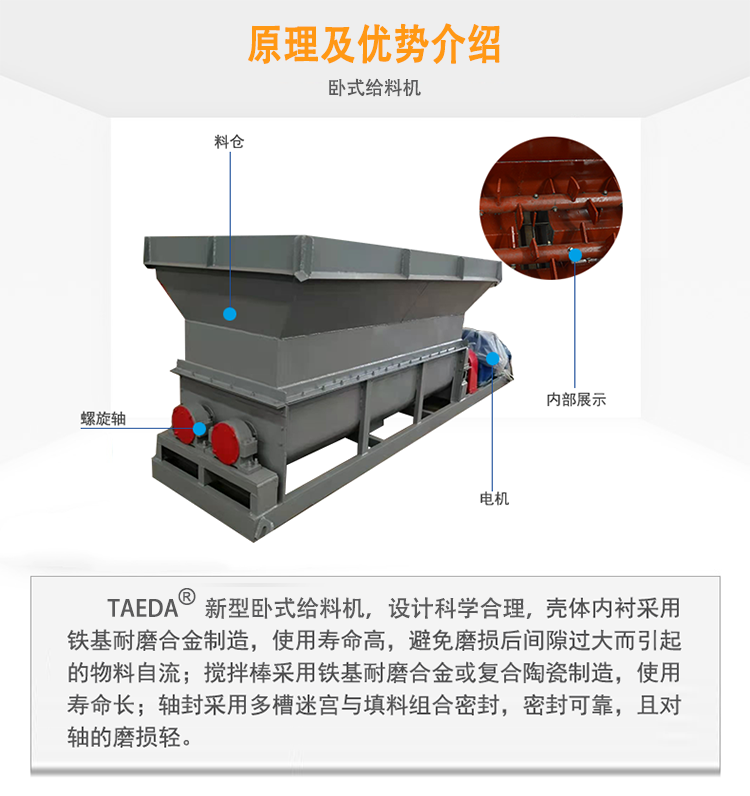 臥式給料機是一種新型高效給料設備,按照原料特性,分為滑架式破拱給料機(適用于高粘度物料的攪拌打散給料),圓盤給料機(適用于顆粒類流動性好的原料),多軸均勻給料機(適用于生物質原料),雙軸打散給料機(適用于煤泥類原料),膠帶箱式給料機(適合于通用性原料)。泰達會根據不同物料配置適合的臥式給料機,實現連續的或不間斷的供料輸送,并且具有較大的暫存緩沖作用,儲料量一般在10m3以上。全系列臥式給料機都采用耐磨特性材料,具有結構合理,堅固耐用,運轉平穩等特點,廣泛用于工礦企業,是比較理想的連續給料輸送設備。